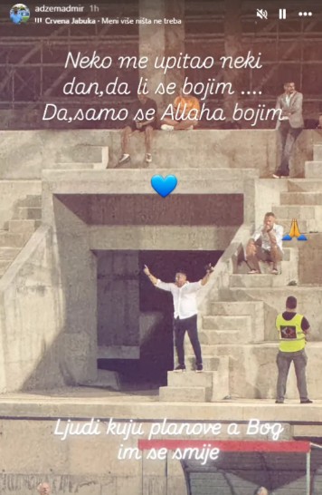 Objavio je fotografiju s nedovršene tribine stadiona “Rođeni”, gdje je tokom meča predvodio ekipu iznad klupa, uz snažnu poruku: “Neko me upitao neki dan, da li se bojim… Da, samo se Allaha bojim. Ljudi kuju planove, a Bog im se smije”, poručio je Adžem.