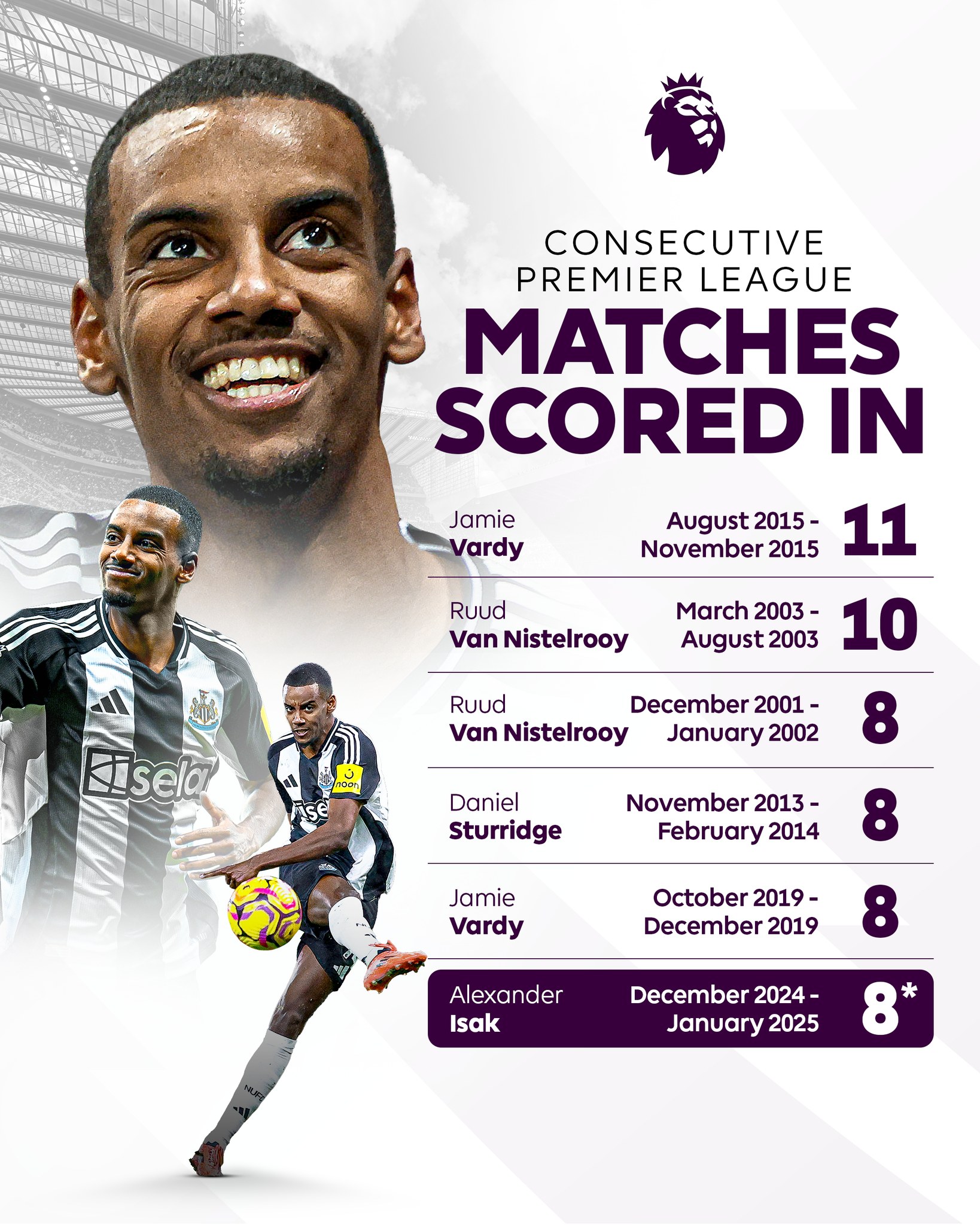 Alexander Isak je tek četvrti igrač u historiji koji je postigao gol u osam uzastopnih nastupa u Premiershipu, nakon što su to prije njega postigli Jamie Vardy (dva puta za Leicester), Ruud van Nistelrooy (dva puta za Manchester United) i Daniel Sturridge (za Liverpool).