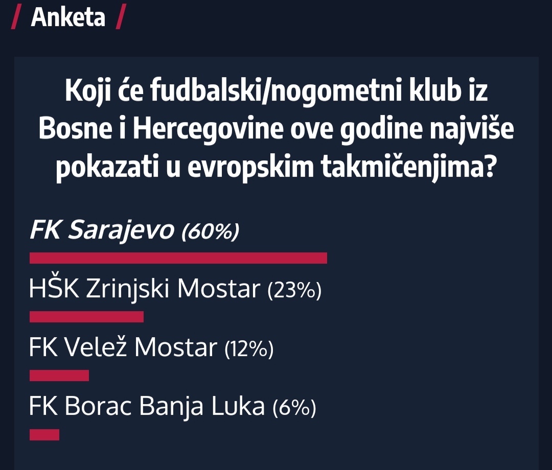 U anketi koja je objavljena na našem portalu prije nastupa bh. klubova na međunarodnoj sceni postavili smo pitanje: Koji fudbalski/nogometni klub iz Bosne i Hercegovine ove godine će najviše pokazati u evropskim takmičenjima?