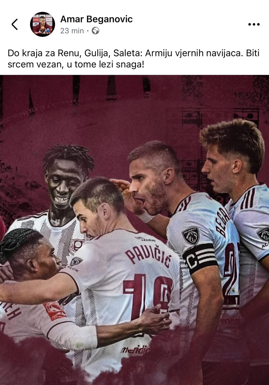 Sa druge strane Amar Beganović je poslao važnu poruku svojim saigračima. Beganović je napisao: “Do kraja za Renu, Gulija, Saleta: Armiju vjernih navijača. Biti srcem vezan, u tome leži snaga!”