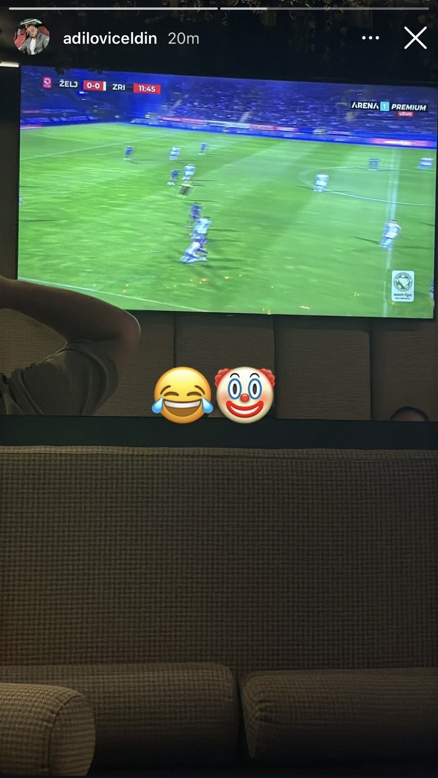 Nedugo zatim Adilović je podijelio još jedan story sa emojijima smijeha i klauna što je reakcija na suđenje u drugom derbiju petog kola između Željezničara i Zrinjskog gdje je nakon VAR provjere poništen rani gol Željezničara.