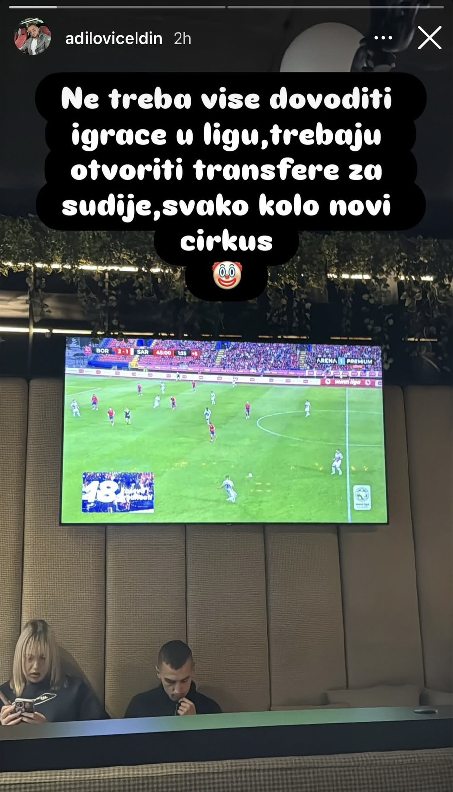 “Ne treba više dovoditi igrače u ligu, trebaju otvoriti transfere za sudije, svako kolo novi cirkus”, napisao je Adilović na svom storyju.