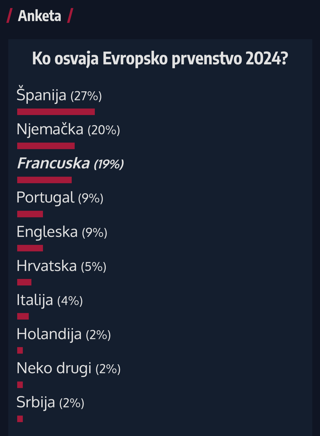 Čitatelji portala Scsport.ba imali su priliku da od početka kontinentalne smotre u anketi glasaju za svog favorita. Pitanje je bilo: Ko osvaja Evropsko prvenstvo 2024?
