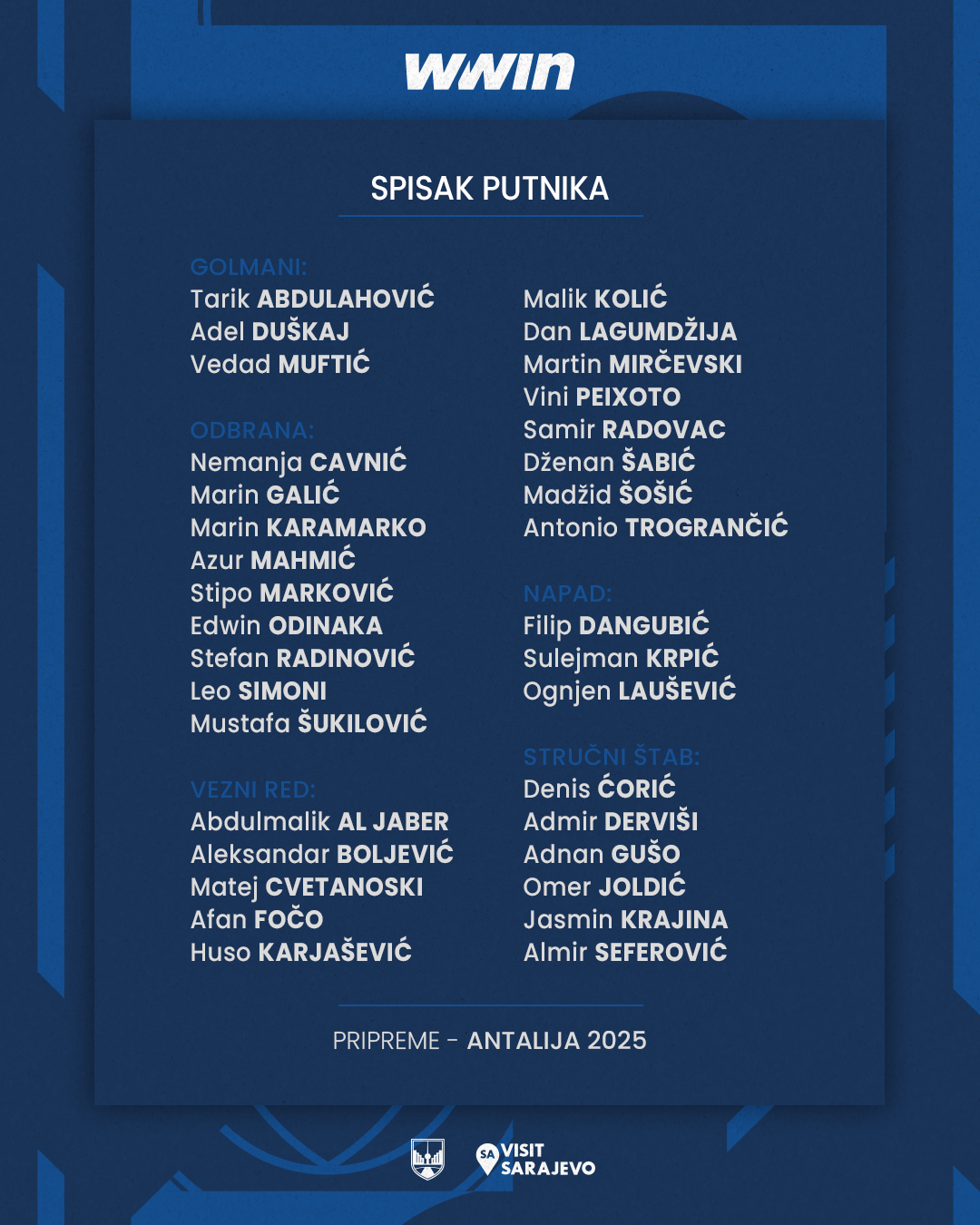 Ekipa Željezničara će već sutra ujutru obaviti prvi trening u Antaliji, odakle će se vratiti 6. februara. Već 8. februara od 18:30 očekuje je prva utakmica proljetnog dijela sezona, i to protiv Vareša na “Grbavici” u okviru osmine finala Kupa Bosne i Hercegovine. Sedmicu poslije “Plavi” će odmjeriti snage sa Zrinjskim na “Stadionu pod Bijelim brijegom” u okviru 18. kola WWIN lige Bosne i Hercegovine.