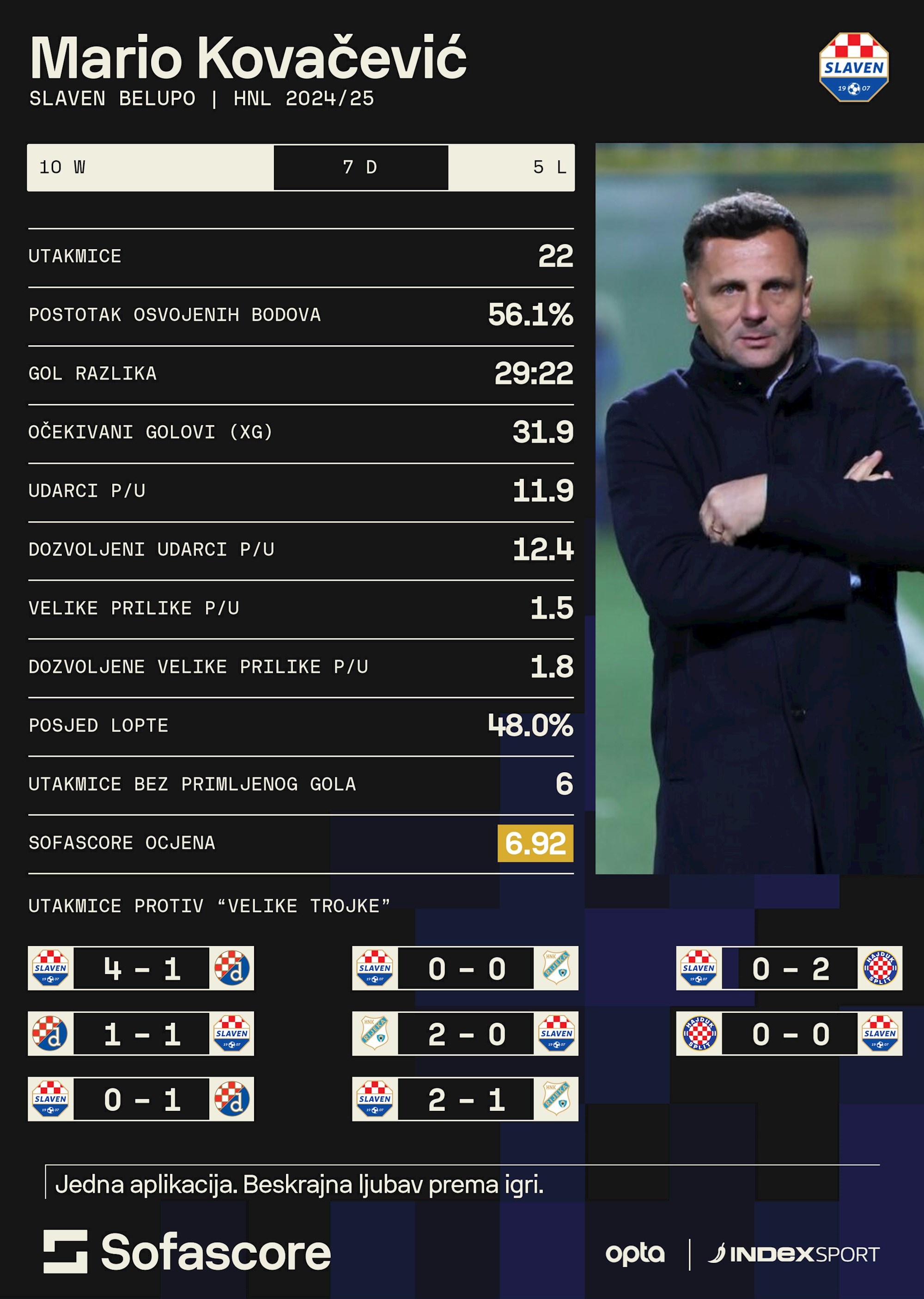 On je Slaven vodio u osam utakmica protiv “velike trojke” hrvatskogfudbala. Pobijedio je Dinamo i Rijeku. Remizirao protiv oba ova kluba i Hajduka. Izgubio je od sva tri velikana po jednom, ali s najviše dva gola razlike, piše Index.hr.