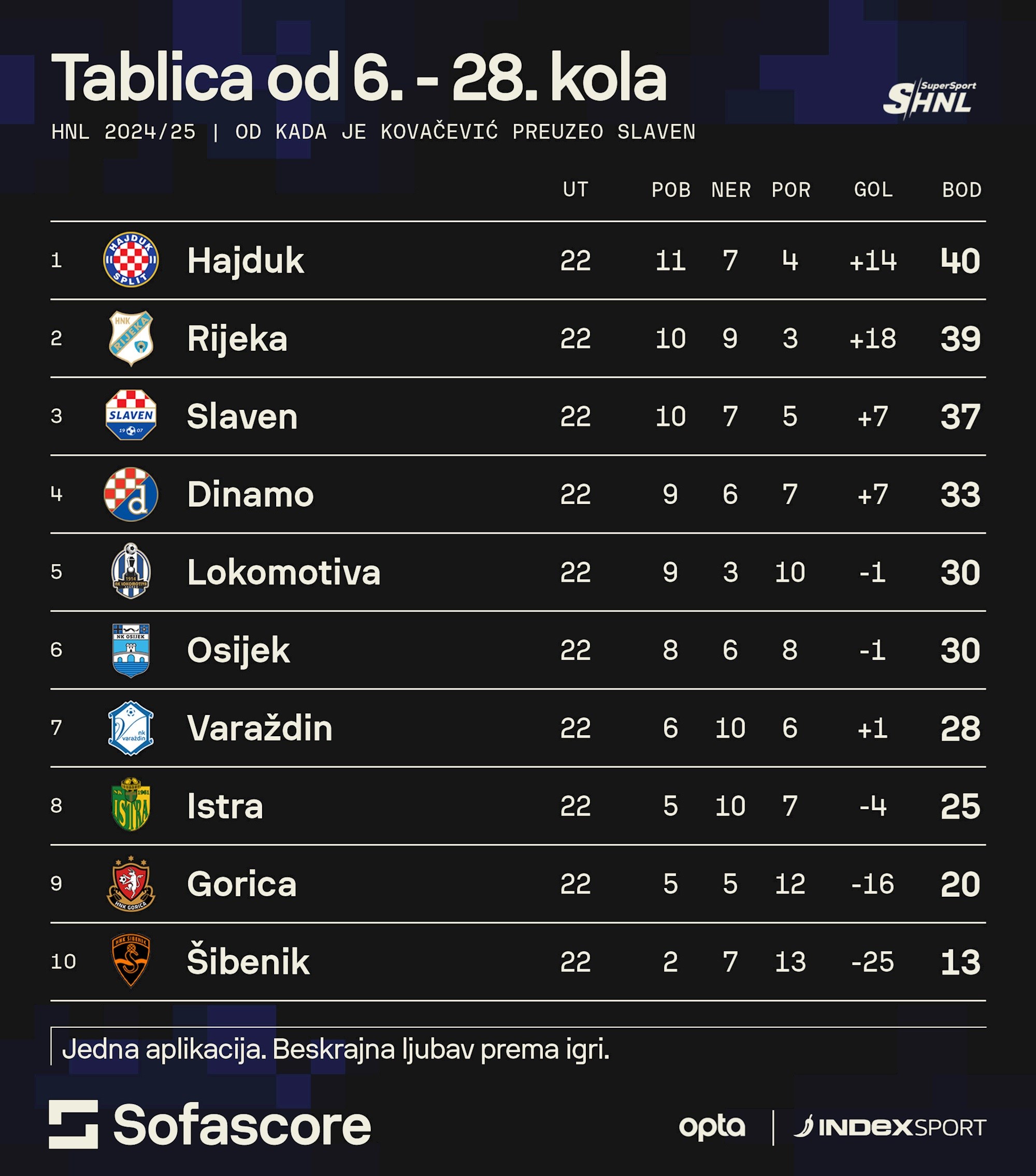 U toj seriji ističe se bod kod Hajduka (0:0). Slavenov niz nepobjedivosti prekinuo je Dinamo tek početkom ovog mjeseca. No, nakon toga je Slaven dobio obje prvenstvene utakmice. Druga je još jedan odličan rezultat protiv kluba iz vrha – Slaven je u posljednjem, 27. kolu HNL-a kolu preokretom pobijedio Rijeku (2:1) i tako je ‘sklonio’ sa prvog mjesta.