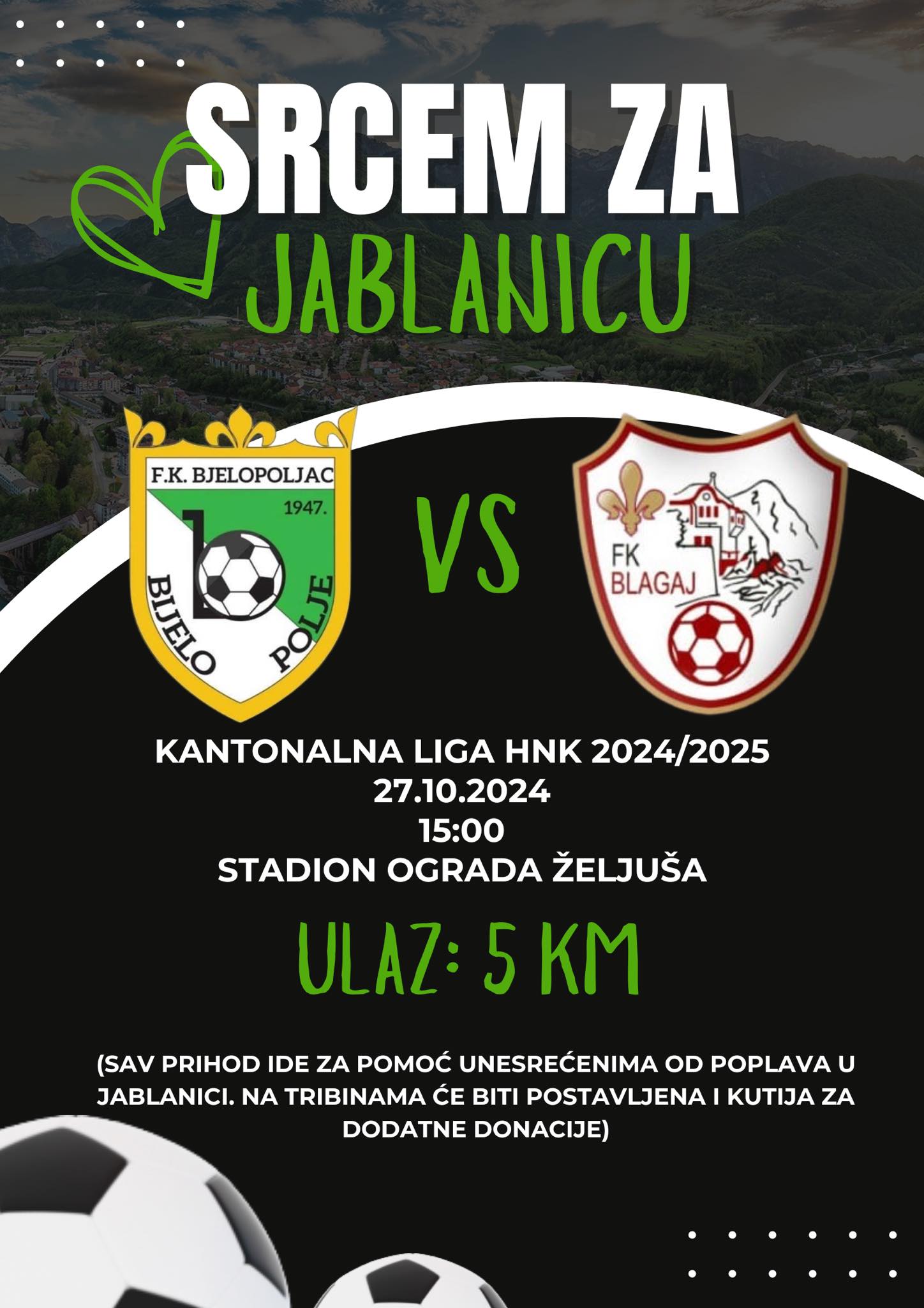 Sav prihod od prodatih ulaznica će biti doniran porodicama stradalih u prirodnoj katastrofi u Jablanici početkom ovog mjeseca. Osim ulaznica po cijeni od 5 KM, svi koji tog dana budu na stadionu Bjelopoljca će moći uplatiti i svoje donacije za Jablanicu, ubacivanjem novca u kutije koje će se nalaziti na stadionu.
