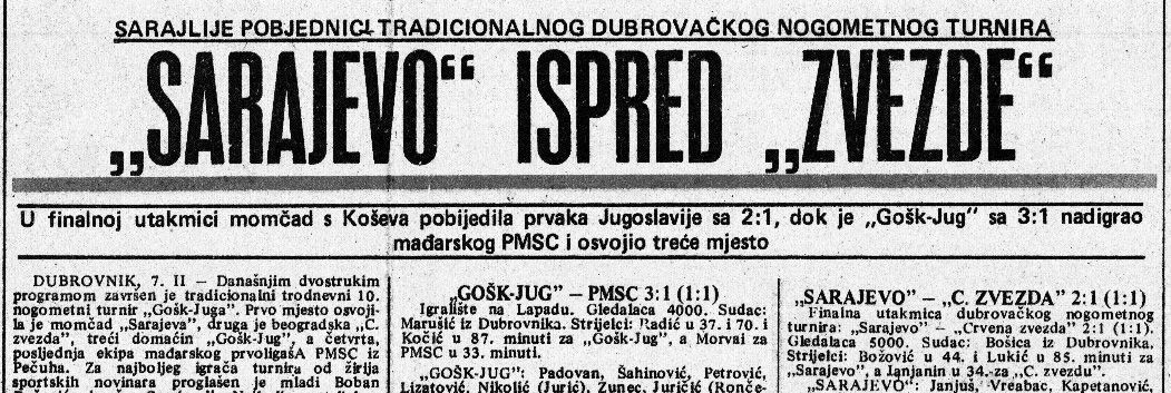 Do odmora je Sarajevo izjednačilo. Sjajnu akciju Bordo tima iskoristio je neuhvatljivi Boban Božović i zatresao mrežu Aleksandra “Dike” Stojanovića (1:1). I u nastavku je viđena ravnopravna igra, bilo je šansi na obje strane, a odluka je pala pet minuta prije kraja, kada je Zoran Lukić pogodio za pobjedu Sarajeva (2:1) i trijumf na Dubrovačkom turniru. Pored pobjedničkog pehara zagrebačkih Sportskih Novosti, klub s Koševa mogao se pohvaliti i nagradom za najboljeg igrača turnira, koju je žiri sportskih novinara dodijelio Bobanu Božoviću.