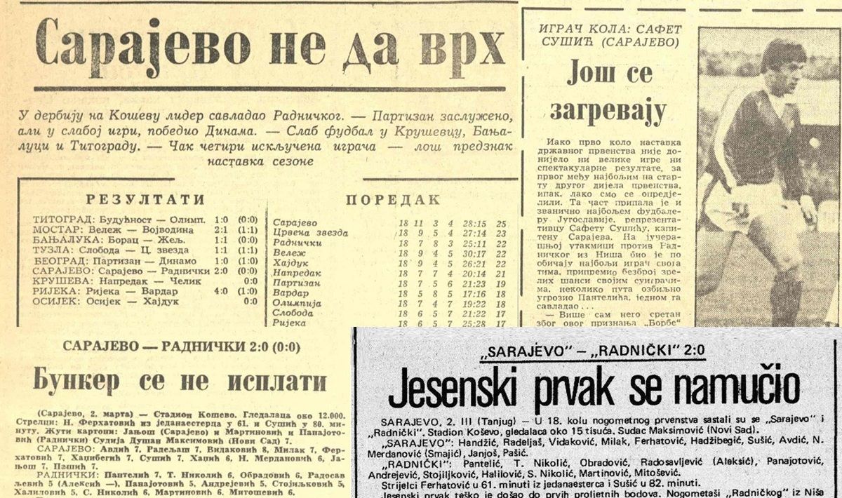 Derbi kola pripao je klubu s Koševa, koji je povećao prednost na tabeli i revanširao se Nišlijama za poraz na Čairu istim rezultatom u prvom dijeli prvenstva. Uspjeh Sarajeva kompletiralo je proglašenje Safeta Sušića za najboljeg igrača 18. kola. I trener Muzurović i kapiten Sušić su nakon utakmice istakli koliko je bilo teško probiti bedem najbolje jugoslovenske odbrane, dok je Dragan Pantelić, kapiten Radničkog, bio kratak: “Domaći su bolje igrali i zasluženo pobijedili”. Mlada ekipa Sarajeva ipak nije izdržala trku s Crvenom Zvezdom i na kraju prvenstva se morala zadovoljiti vicešampionskom titulom, dok je Radnički završio na trećem mjestu što je bio najbolji dotadašnji uspjeh u klupskoj historiji.