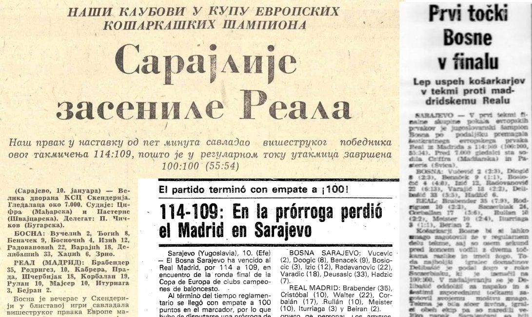 Oko 7.500 gledalaca vidjelo je fantastičnu košarkašku predstavu na današnji dan prije 46 godine. Mladi tim Bosne nije imao respekta prema zvijezdama Reala – Brabenderu, Corbalánu, Szczerbiaku, Rullánu… Puleni Bogdana Tanjevića su stalno vodili, u nekim trenucima i s 10 poena prednosti, ali se evropski prvak uvijek vraćao. Nakon što su na odmor otišla s “pola koša” prednosti (55:54), i u nastavku Studenti, predvođeni Mirzom Delibašićem, ne ispuštaju vodstvo. Činilo se da je utakmica riješena nakon što je najbolji igrač gostiju Wayne Brabender napustio teren zbog pet ličnih grešaka. Nekoliko sekundi prije Bosna je vodila 100:98 i imala loptu, a onda je Delibašić napravio neočekivanu grešku, pa je Szczerbiak skoro sa zvukom sirene uspio izjednačiti i izboriti produžetak za Real.