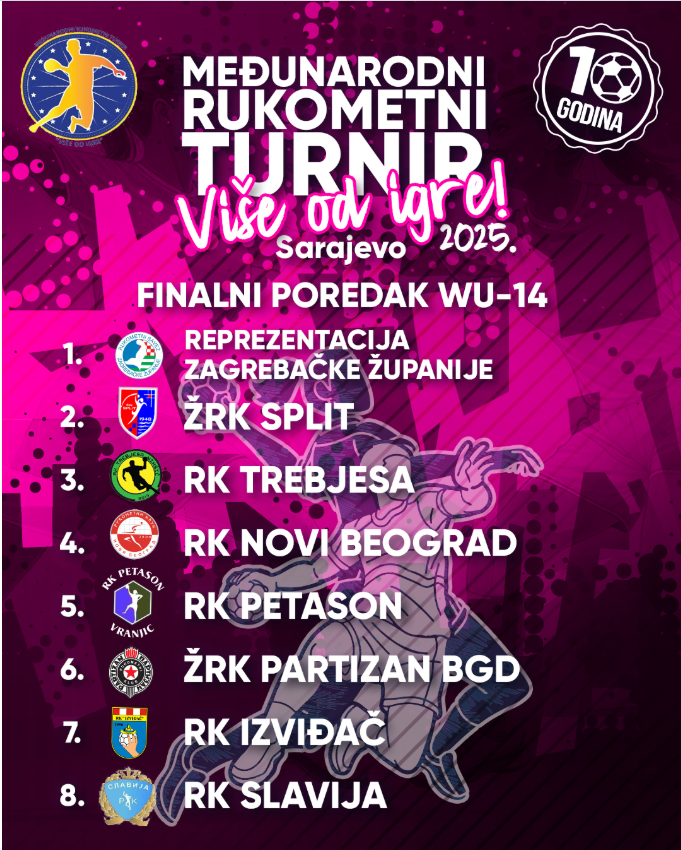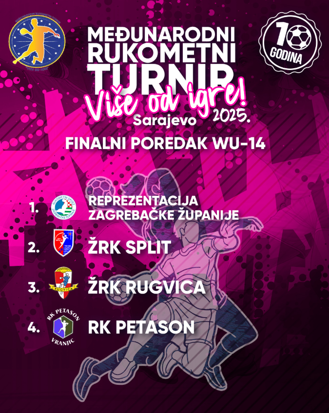 Svečanim proglašenjem pobjednika i dodjelom pehara u nedelju, 14. septembra, u glavnom gradu Bosne i Hercegovine završen je jubilarni 10. međunarodni rukometni turnir za djevojčice i dječake pod nazivom “VIŠE OD IGRE“.