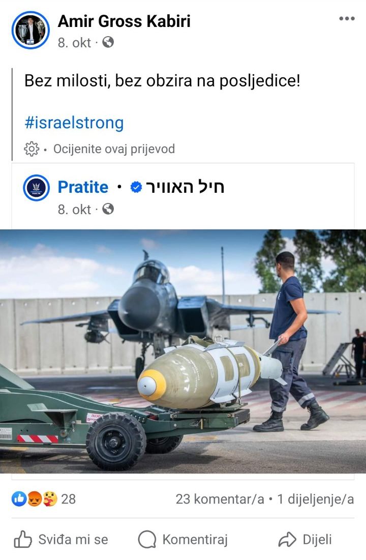 Kabiri je na društvenim mrežama podijelio fotografiju ratne letjelice i oružja namijenjenog za napad na pojas Gaze, te napisao: “Bez milosti, bez obzira na posljedice”.