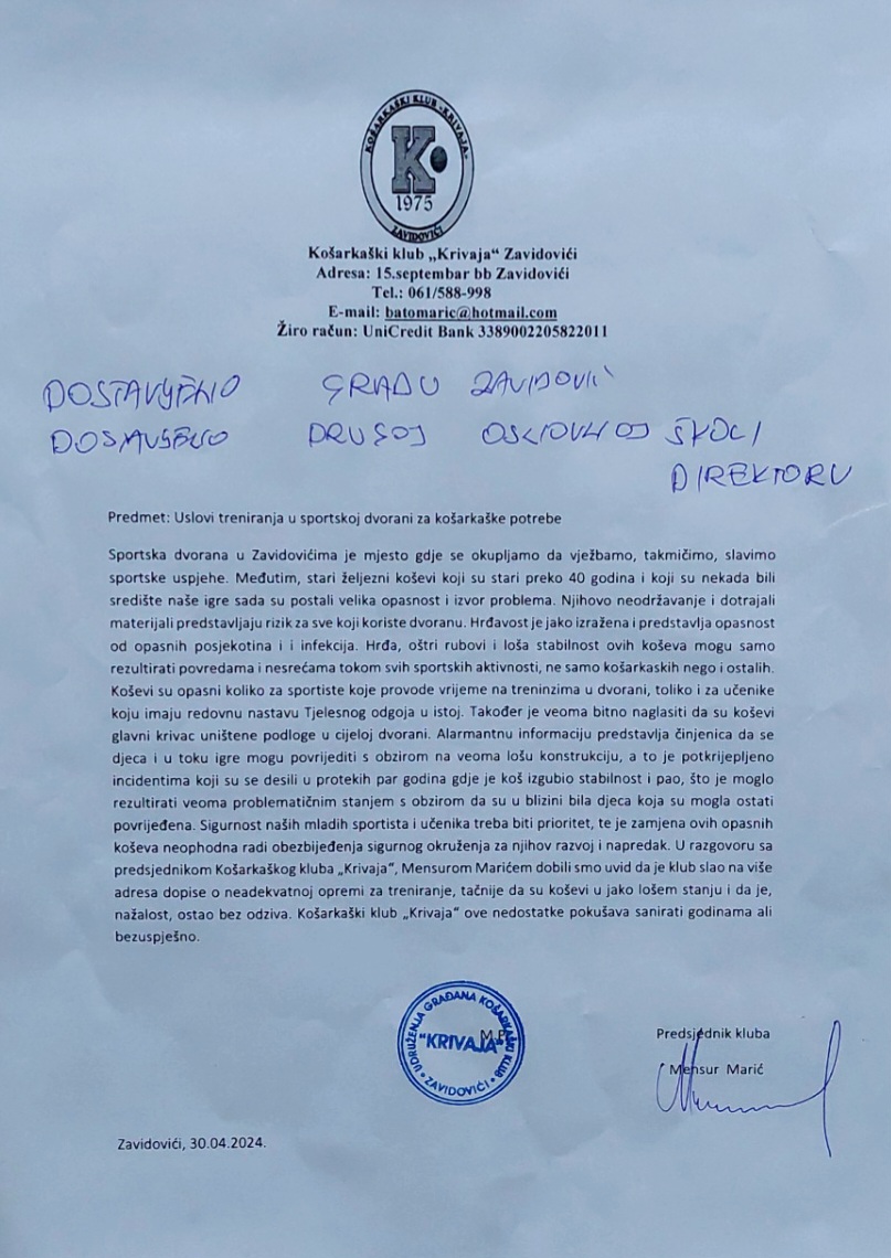 Košarkaški Klub Krivaja upozorava da je oprema sa kojom rade stara preko 40 godina i da su koševi i i njihova ogoljena željezna konstrukcija postali velika opasnost i izvor problema za sve oni koji koriste, ne samo same koševe, već i dvoranu, nezavisno od toga li se u dvorani igra košarka ili ne.