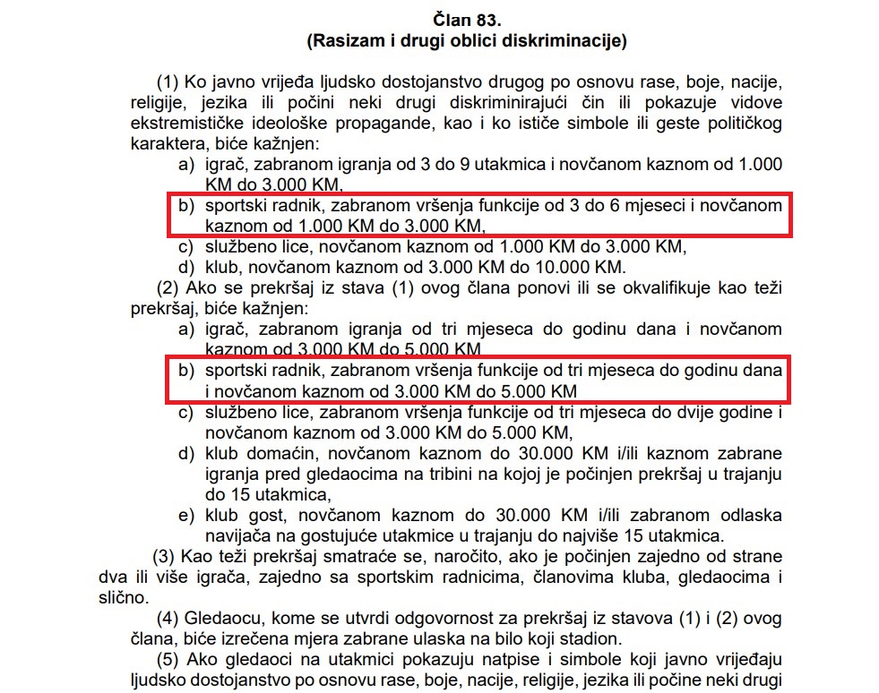 “Ko javno vrijeđa ljudsko dostojanstvo drugog po osnovu rase, boje, nacije, religije, jezika ili počini neki drugi diskriminirajući čin ili pokazuje vidove ekstremističke ideološke propagande, kao i ko ističe simbole ili geste političkog karaktera, bit će kažnjen”, decidan je Fudbalski savez Bosne i Hercegovine.